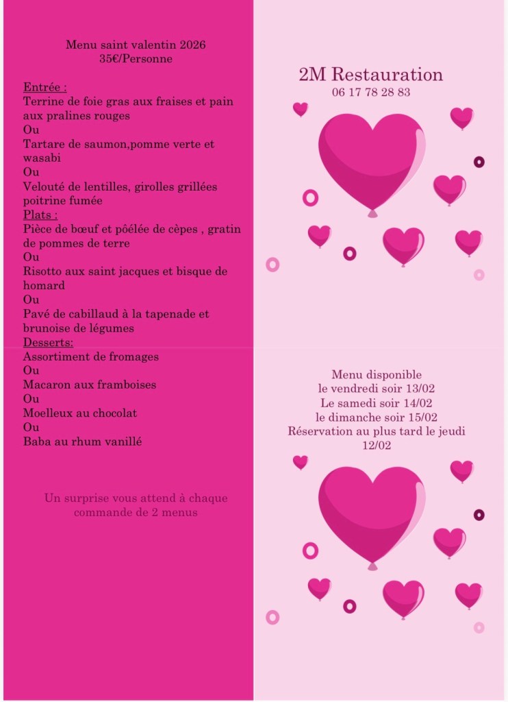 Menu saint Valentin Publié par2mrestauration29 janvier 2026Publié dansNon classé Partager : Partager sur X(ouvre dans une nouvelle fenêtre) X Partager sur Facebook(ouvre dans une nouvelle fenêtre) Facebook J’aime chargement…